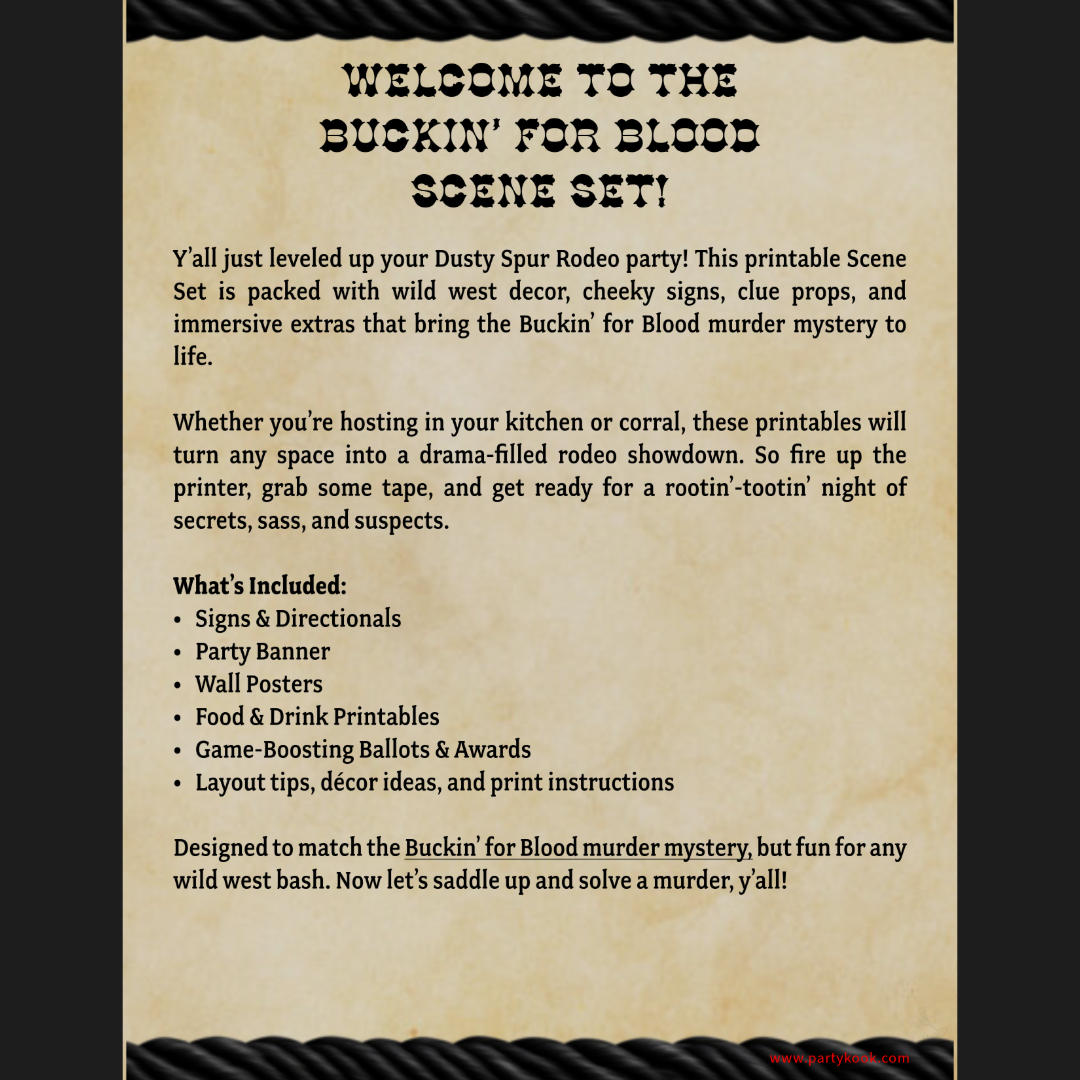 The Buckin’ for Blood Scene Set is your printable toolkit for transforming any space into the Dusty Spur Rodeo, with no crafting skills or event planner budget required. Designed to pair perfectly with the Buckin’ for Blood Murder Mystery Game, this download-only kit gives you everything you need to decorate your party space, guide your guests, and create a full Wild West experience.