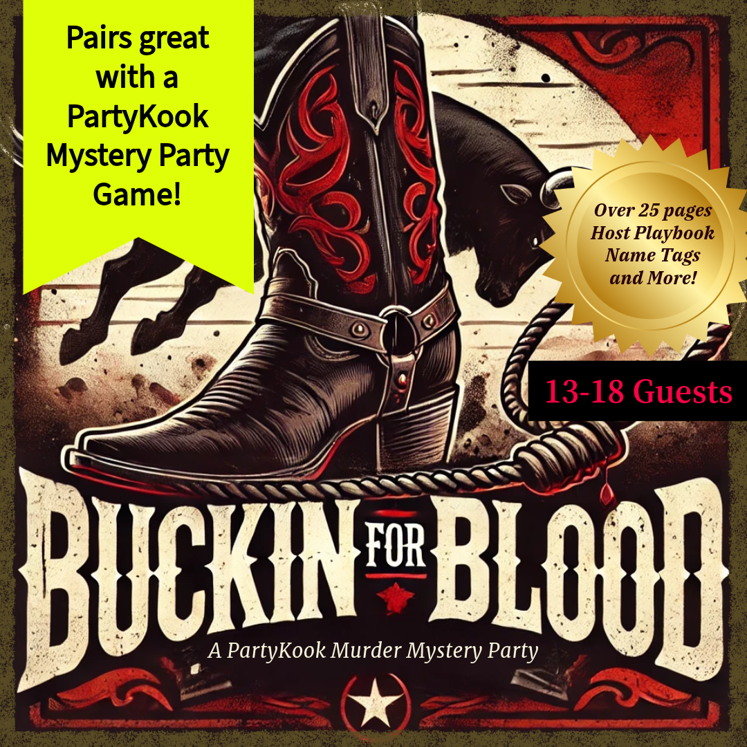 • Pairs perfectly with the Buckin’ for Blood Murder Mystery Game Kit