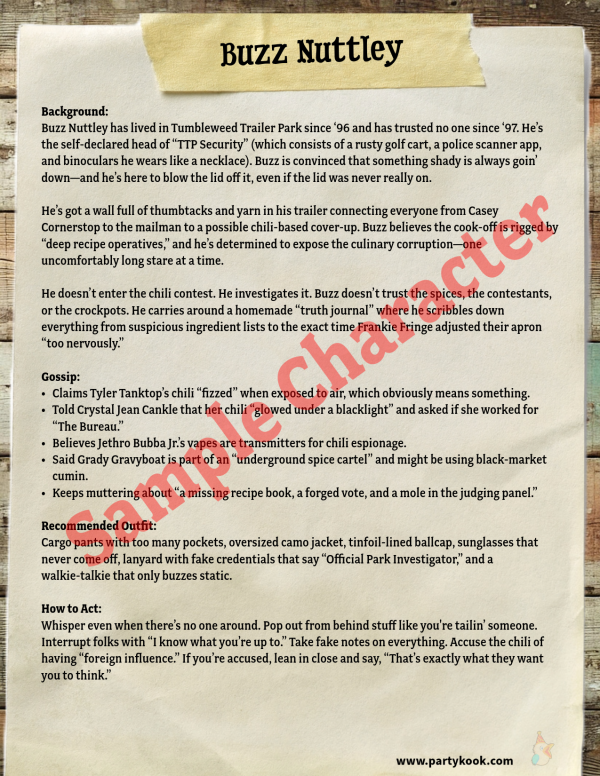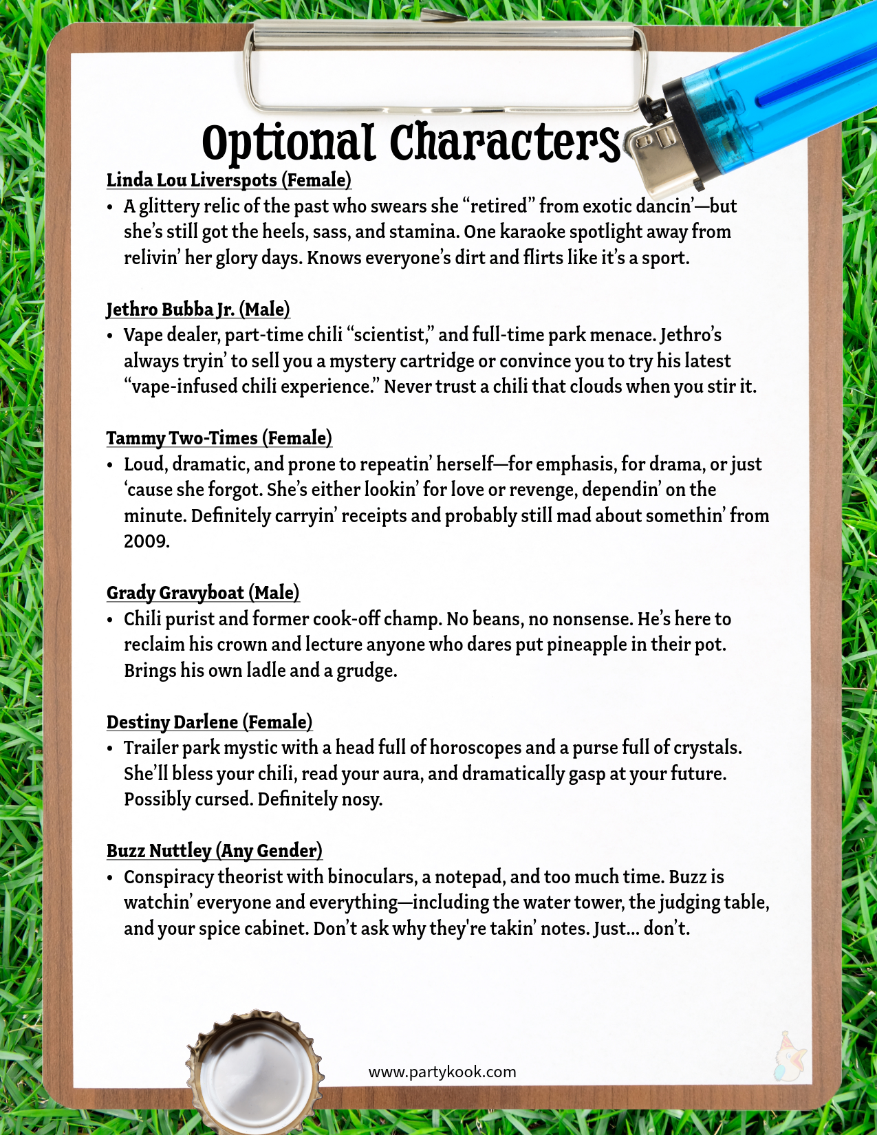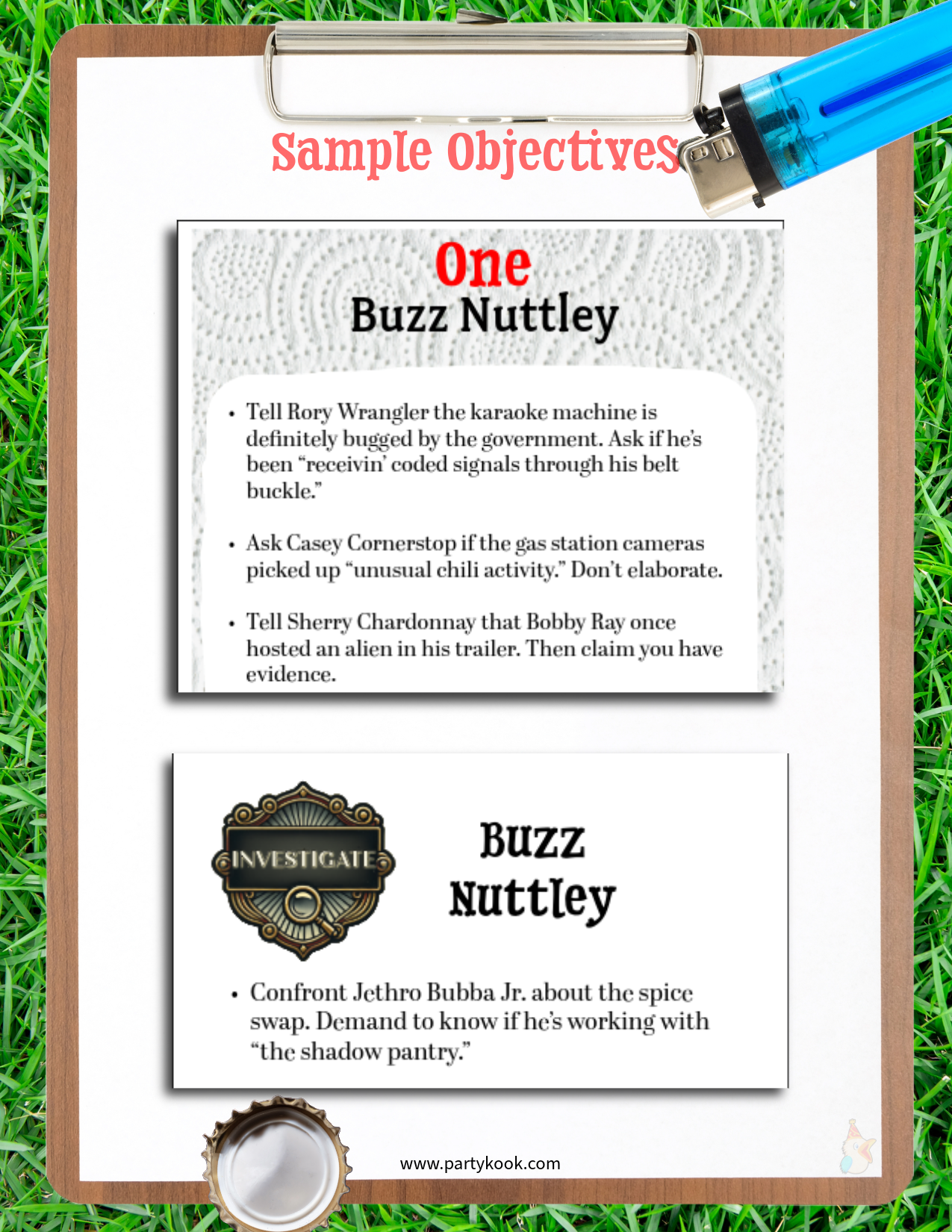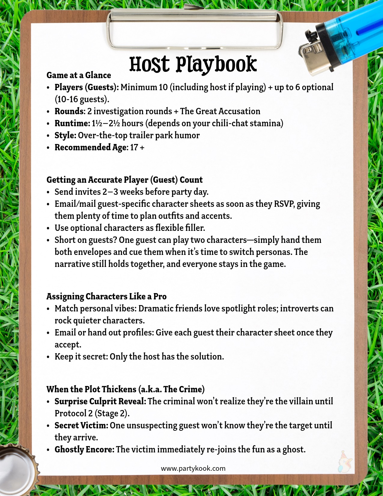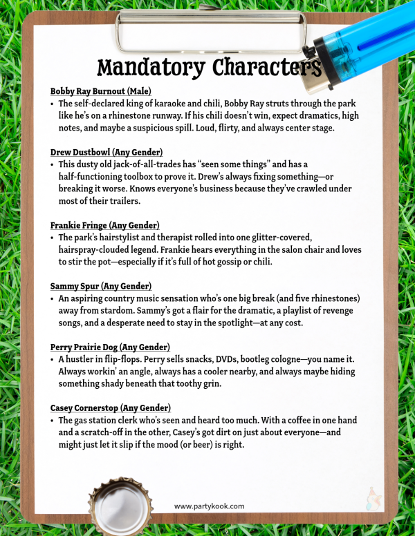 Whether you’re throwin’ this bash in your backyard, kitchen, or full-blown trailer, this murder mystery game guarantees laughs, drama, and memories hotter than your uncle’s five-alarm chili.