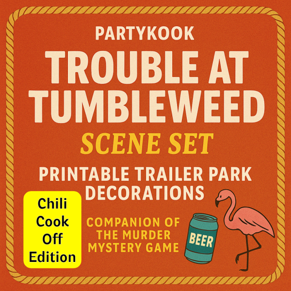 The Trouble at Tumbleweed Scene Set is the ultimate printable party pack to pair with Trouble at Tumbleweed: A Trailer Park Murder Mystery. Instantly trash up your space with hilarious posters, directional signs, food labels, awards, and more—styled to match the chaos, cattiness, and chili-fueled drama of the game.